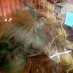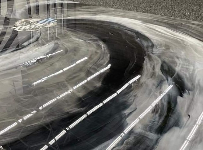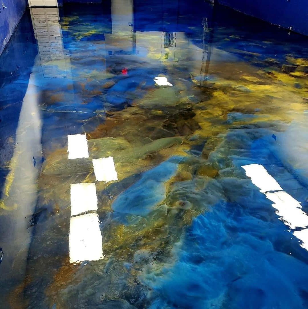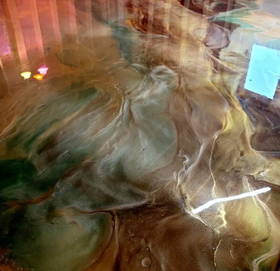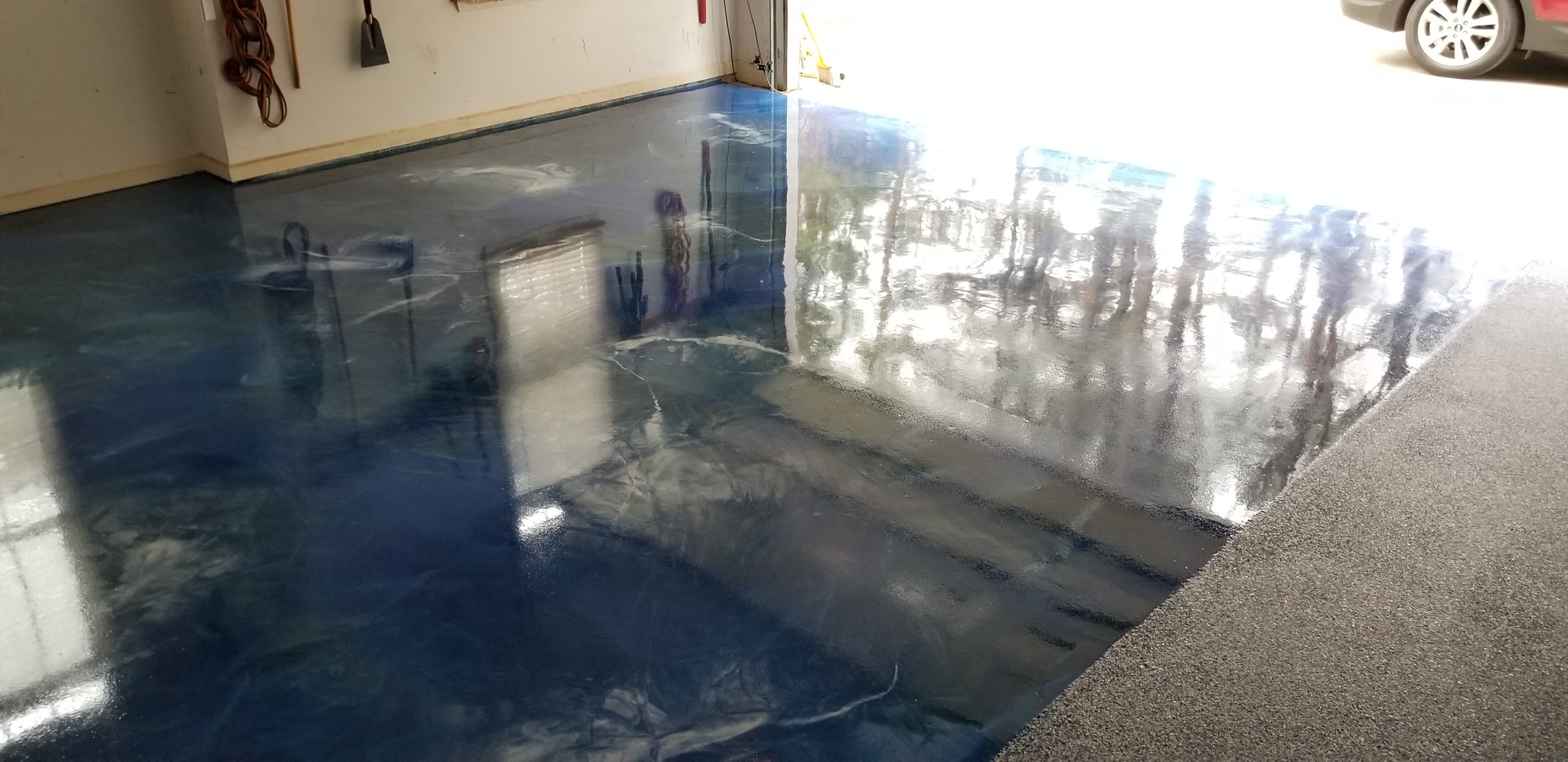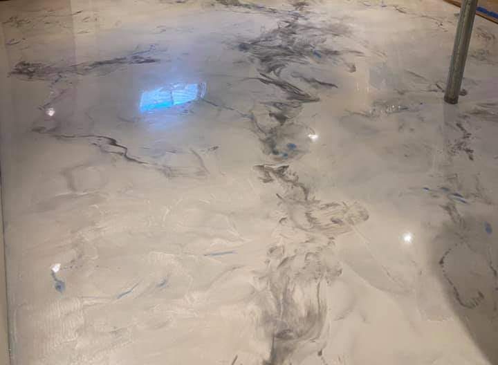3. We then apply a 2nd coat of epoxy using different metallic pigments/colors and can create unique designs with squeegees, leaf blowers and other techniques and then let dry.